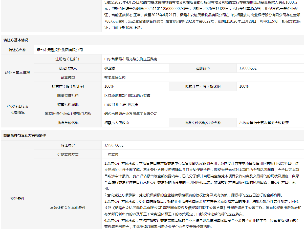 棲霞市安達民爆物品有限公司100%國有股權(quán)及債權(quán)