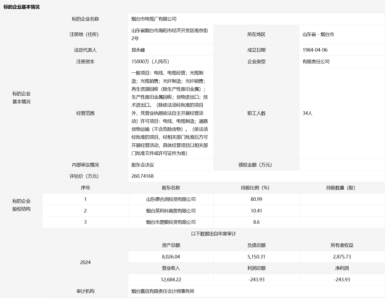 煙臺市電纜廠有限公司8.6%國有股權(quán)
