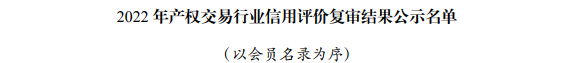2022年產(chǎn)權(quán)交易行業(yè)信用評價(jià)復(fù)審結(jié)果在全國行業(yè)信用公共服務(wù)平臺(tái)和中國產(chǎn)權(quán)網(wǎng)進(jìn)行公示,煙臺(tái)聯(lián)合產(chǎn)權(quán)在協(xié)會(huì)信用評價(jià)復(fù)審中,繼續(xù)維持AAA級(jí)評定不變。